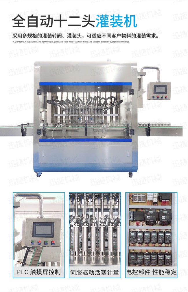 2、灌裝機(jī)以進(jìn)口PLC電腦控制、伺服驅(qū)動(dòng)計(jì)量,全彩色觸摸屏人機(jī)界面,一鍵完成計(jì)量切換確保容量之調(diào)整簡(jiǎn)易、快捷、準(zhǔn)確。是任何形式的灌裝機(jī)無法替代的;
