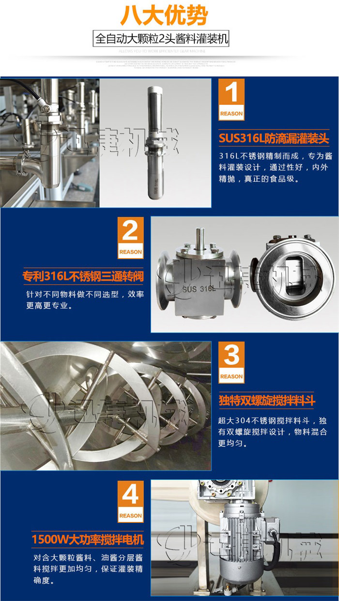 該系列灌裝機(jī)采用活塞式氣缸氣動(dòng)原理,適用于調(diào)味品中帶顆粒并且濃度較大的香菇醬、辣椒醬、豆瓣醬、花生醬、芝麻醬、果醬、牛油火鍋底料、紅油火鍋底料等較為粘稠醬類的灌裝。灌裝轉(zhuǎn)閥可以很具客戶物料定做加大,以適應(yīng)不同客戶物料的灌裝需求。